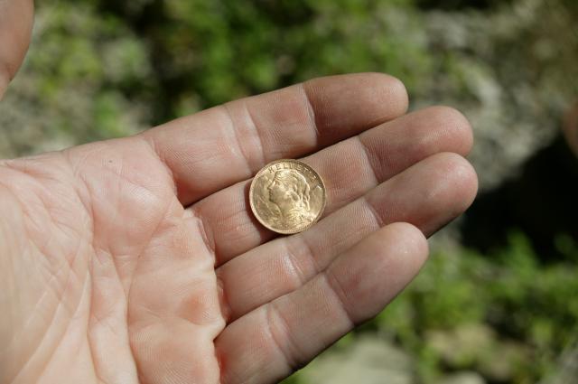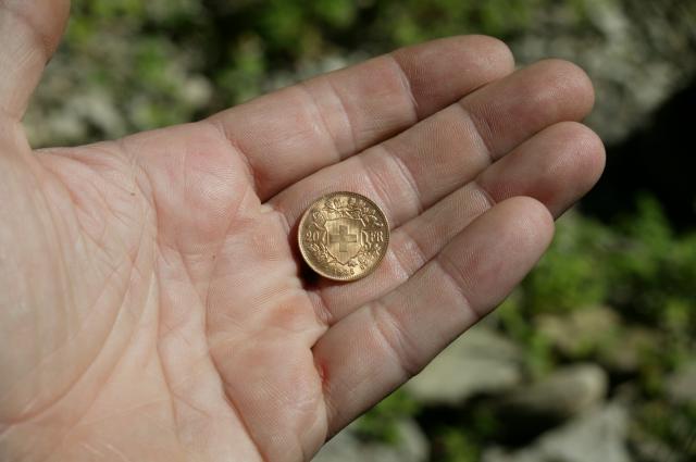 em…… alle die es nicht kennen ein schweizer GOLD vreneli …1935 so um 260 euro wert 🙂