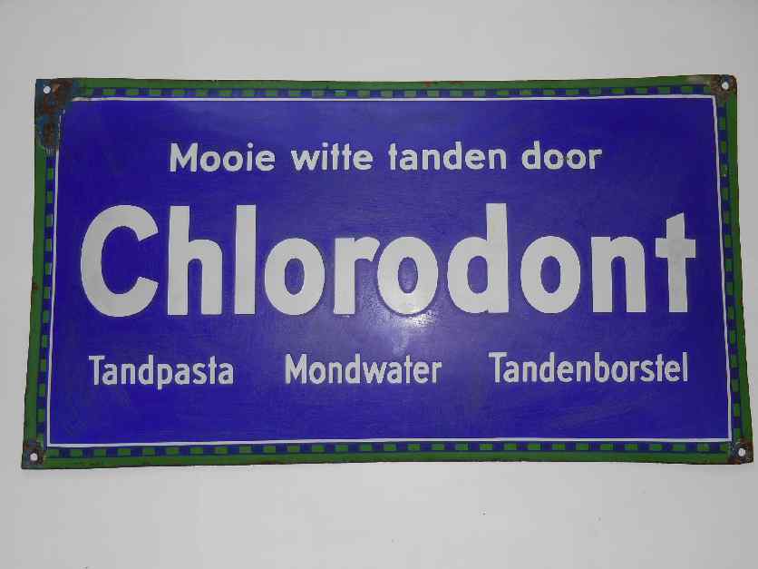 Der Klassiker mit Niederländischer Schrift. Ein exotisches Schild für den Zahnpasta- und Chlorodontschildersammler. Das Schild zeigt wie weit Chlorodont weltweit aktiv Schilder verteilt hat, denn es wurde in einer Holländischen Kolonie entdeckt. Sehr selten.