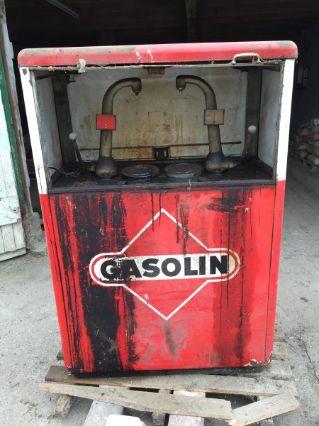 Nach erster Inaugenscheinnahme vor Ort-kannte es sonst nur von Fotos-stellte sich jedoch schnell Ernüchterung ein. Nicht ganz so gut wie erhofft ,aber dennoch mit Potenzial. Leider hatte der sehr junge Verkäufer, welcher mir verriet das sein Großvater selbiges Kabinett vor geraumer Zeit herangeschafft hatte, um es für den eigenen Gartenbaubetrieb zu nutzen vergessen mitzuteilen, dass sich noch ungefähr 10l Altöl in den Tanks befinden. Bis zum Verkauf war es nämlich im Einsatz-und so sah es in der Tat auch aus.