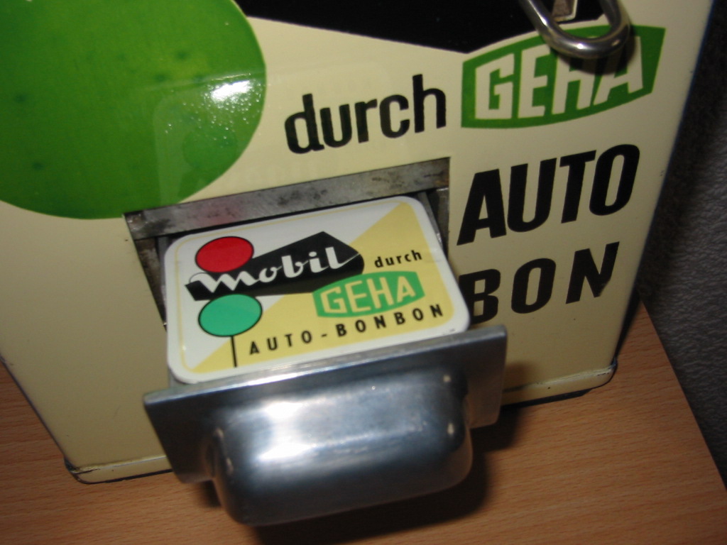 Seit gestern bin ich stolzer Besitzer eines der verrücktesten Automaten,die sich je ein menschliches Hirn ausgedacht hat: Der GEHA Auto-Bonbonautomat ! Und das tollste: Er ist randvoll mit den originalen,kleinen Blechdosen mit Inhalt(nach Jahrzehnten nur bedingt zum Genuss empfohlen;-)