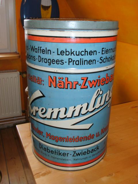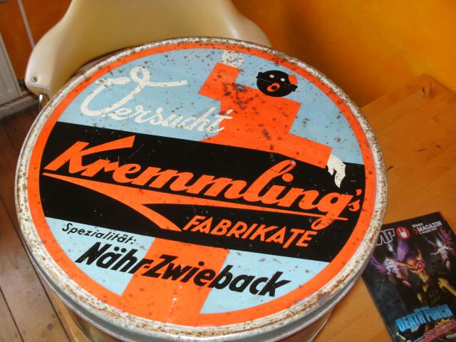 Hey die Dose ist „jsj“ (janz schön jrooß), 28 cm x 20 cm. Ich reiße gleich mal den Deckel ab, klopp die Kanten platt, bohre 4 kleine Löcher in die Ecken und Stelle es bei ebay als seltenes Blechschild ein. 🙂 🙂 🙂