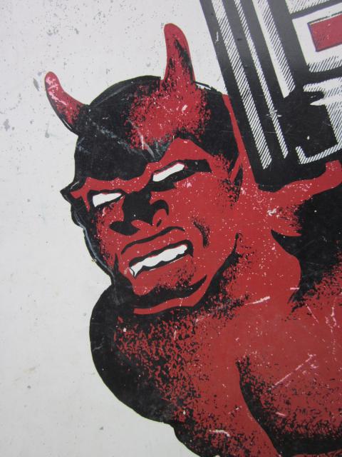 Gestern kam es dann an und ich staunte nicht schlecht, was da zum Vorschein kam. Der Schild ist eindeutig händisch mit Lackfarbe hergestellt worden. Bei den Motivteilen wurden Schablonen und teilweise Siebdrucktechnik verwendet. Das Ganze befindet sich dann noch auf einem Blechträger, der zuvor offensichtlich mit einem anderen Motiv bedruckt war (zu erkennen an dem umgepfalzten Rand auf der Rückseite, dort sind auch noch Reste einer Herstellerbezeichung, eine Reklamrfabrik in Bombay, zu finden.)