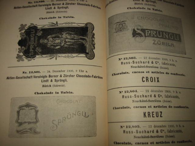 zuerst fragte ich mich warum chocolat suchard diese nahmen registrieren liess…… fremdsprachen luchhard, schuchard, sechard, souchard, suchart, oder tuchard…. hä ich glaubte ich spinne aber plötzlich da fällt die „schokoladen tafel“, damit wollte suchard verhindern das ähnlich klingene plagiate hergestellt werden können. gerade suchart mit t statt einem d….. logisch ihr könnt sogar den tag 24 märz1900 zeit 8.00 (denke die zeit war wichtig wenn da 2 dasselbe wollten….) bei jedem registrierten markennahmen lesen….. das jüngste der 5 bücher ist von 1918 und am 31.12.1918 wurden bereits 43’216 marken geschützt, leider habe ich keine ahnung bis wann dies gemacht wurde, aber wenn zwischen 1891 und 1918 alleine über 43’000 marken registriert wurden, so ist da ein riesenschatz zum datieren von produkten vorhanden. leider habe ich bis jetzt im netz kein hinweis auf weiter bücher finden können 🙁 … aber ich gebe die hoffnung nicht auf, den mit diesem werk könnte einiges aus dieser zeit genauer bestimmt werden….