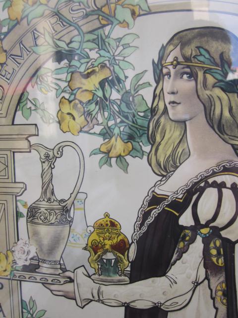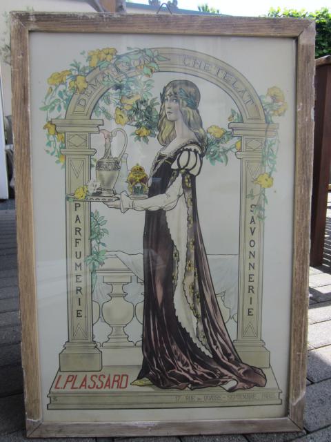 Im Gegensatz zu den vielen Pseudo-Dachbodenfunden in der e-bucht, hier mal ein Teil, was wirklich vor wenigen Tagen von einem befreundeten Entrümpler bei einer Haushaltsauflösung auf dem Dachboden geborgen wurde. Phantastische 60 x 40 Jugendstil-Werbepappe hinter altem Glas gerahmt aus Frankreich ca. 20er Jahre.