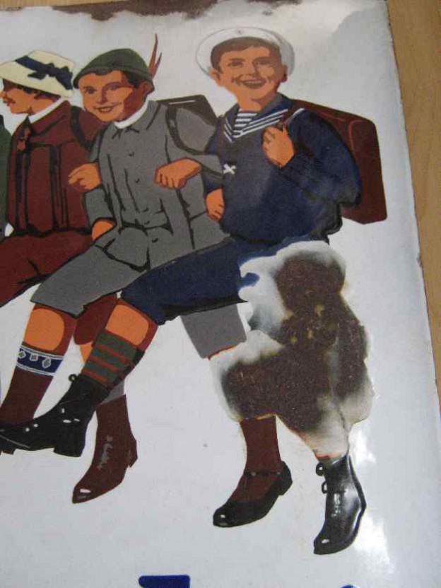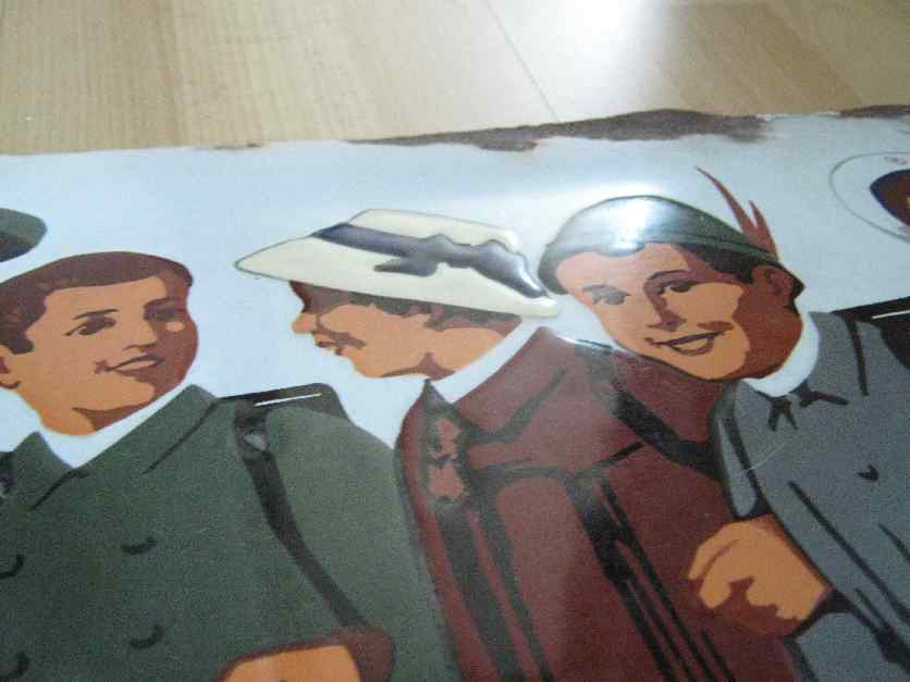 Das Original Schild aus der Fernsehsendung (was ich bis letzte Woche selber nicht wusste) das ich bereits im März von einem Ebay Händler gekauft habe. Das es sich hier um die seltenere große Version mit 50x75cm handelt hätte der Experte eigentlich wissen müssen. Es ist im moment noch nicht gereinigt oder Poliert und hat hier und da leichte Kratzer, der Glanz und die Farben sind aber denoch sehr schön erhalten. Ich habe zwar mehr gezahlt als der Händler für beide gezahlt hat,aber damit kann ich Leben.
