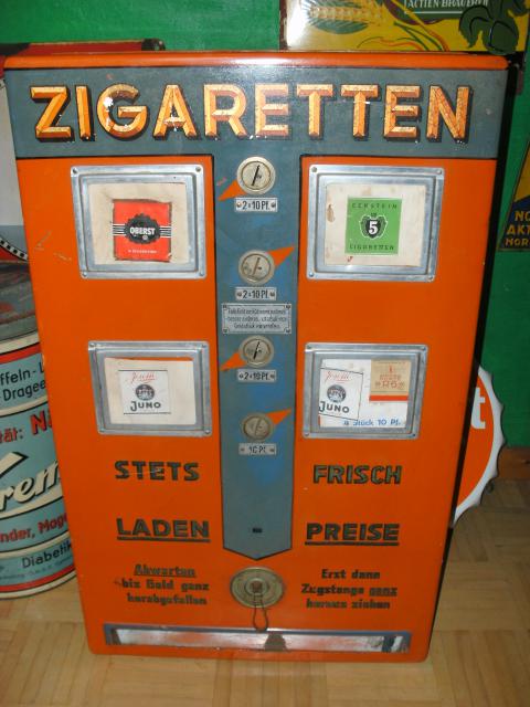 Ich besitze auch noch einen schönen,alten Zigiautomat mit 2 Schächten und Drehgriff der Firma ADE,etwas platzsparender im Format als dieser hier 🙂 Wurden mal Eckstein-Zigaretten drin verkauft…