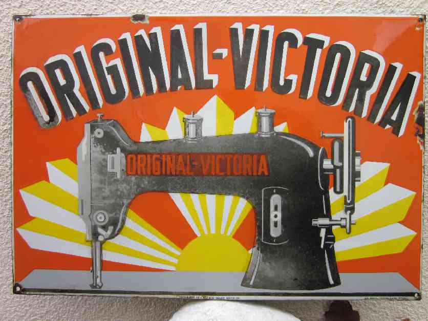 Gestern dienstlich im Ruhrpott unterwegs – gestresst – auf dem Rückweg am Abend erst Regen + Stau, dann viel Regen + viel Stau, dann noch mehr Regen + noch mehr Stau => Grrrrrrrrrrr => ich gönne mir jetzt noch was, was Spaß macht – also in Düsseldorf raus und hin zu nem kleinen Antikladen, wo ich ab und zu mal vorbeifahre und wo man so herrlich in Stapeln von schönem altem Kram rumwühlen kann – hach das tut jetzt richtig gut – hinter einem Stapel Bilder blitzt eine Ecke Emaille – Stress und Staufrust sind im nu weg – jetzt geht es nur noch um die wirklich wichtigen Dinge im Leben 😉 – ich ziehe ein 60 x 40 Victoria-Nähmachinenschild von 1935 ans Licht – das Schwarz ist an der Oberfläche verwittert, aber sonst schöner Zustand – Preis ist voll OK, ja sogar günstig – also ab in den Kofferraum und bestens gelaunt ab nach Hause – übrigens ohne Stau 🙂