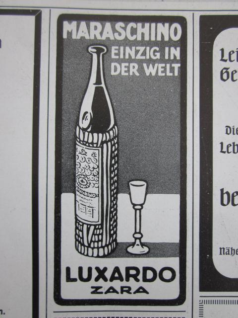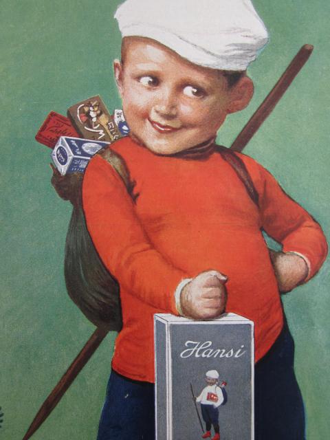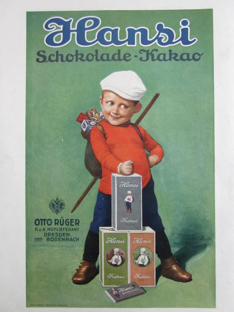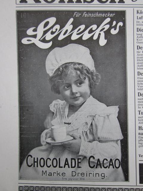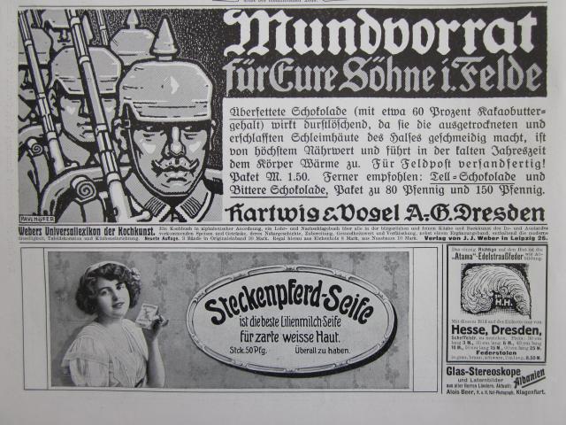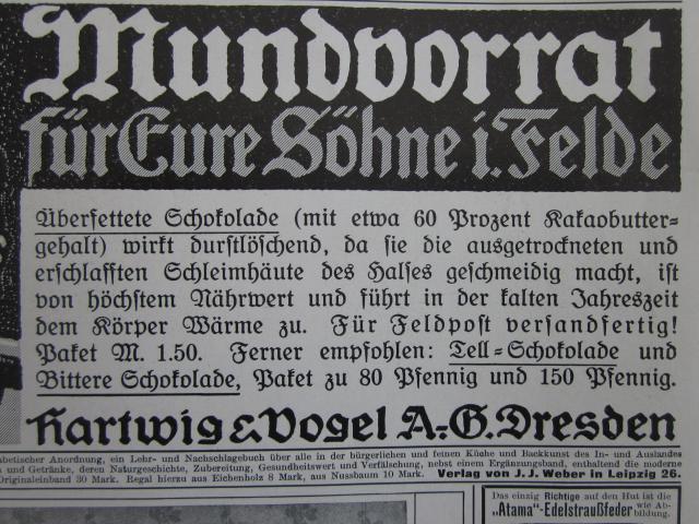 Heute beim Stöbern auf dem Flohmarkt in Düsseldorf fiel mir ein Stapel alter Zeitschriften auf – Illustrierte Zeitung vom J.J. Weber Verlag Leipzig – ich schau mir dann mal gerne die alten Werbeanzeigen an. Eine Ausgabe (29. Oktober 1914) hatte dann sogar ein kleine Überraschung zu bieten – bei sonst nur schwarz-weiss Darstellungen eine farbige ganzseitige Werbeanzeige mit dem Rüger Hansi (immerhin auch 35 cm x 22 cm) – das Maraschino-Motiv als Emailleschild wäre sicher auch nicht schlecht gewesen – man beachte auch den Text der „Mundvorrat“-Hartwig&Vogel Anzeige bez. der „überfetteten“ Schokolade und wie gut sie angeblich den Soldaten tut – schon etwas „schräg“, gell? 😉