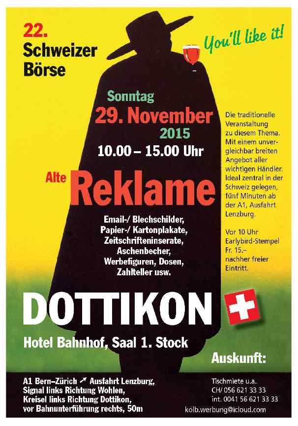 Einladung zur 22. Börse Dottikon Schreibe eine Antwort Hier ANKAUF Emailleschilder Blechschilder Automaten Unsere Angebote und Tagesauktionen Werben auf schilderjagd.de Hier eine Echtheitsanfrage stellen