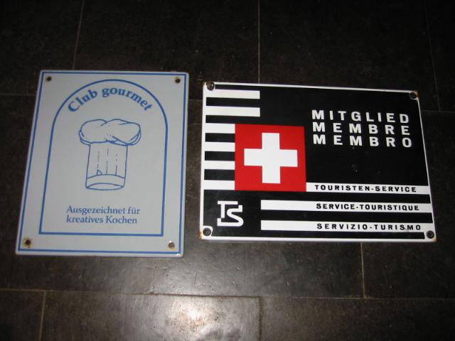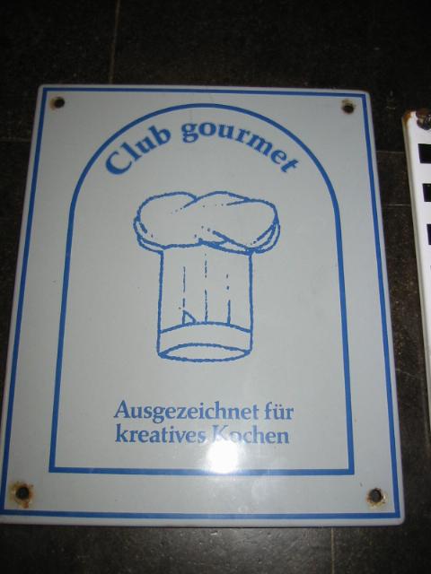 habe ich schon ist hässlich und massenware (tausche es gerne gegen cincano pferd, sandemann frau / mann oder so 🙂 ) …. und da mann ja nicht stehlen tut…… sah ich es jede woche….. aber gestern war es anders….eine mulde viele sachen darin auf dem bank und den fenstersimsen gläser und anderes zum mitnehmen….. ich sagte mir wenn nach der sitzung das schild noch dort ist nehme ich es …. :-)…sitzung vorbei…. heimfahren und siehe da…. emailschild an der hauptstrasse steht immer noch da……blinker bremsen aussteigen und einsacken…. was ich bis heute da aber nicht sah und es fiel mir auch erst auf als 1 meter davor stand, war das linke schild…..habe ich noch nie gesehen, wohl 60-70-80 er jahre, aber bis heute unbekannt, was ich überall sehe ist das grosse weisse mit dem kochhut…aber das hässlichevioletteblaue würgige ding….völlig unbekannt