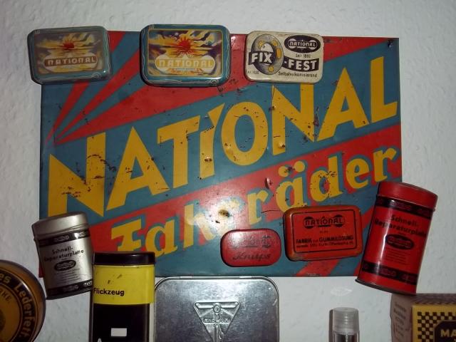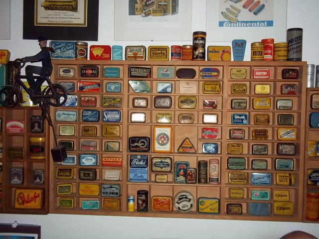 Hallo zusammen! Habe seit knapp 30 Jahren einen Fahrradladen. Dieser wurde vorher geführt von einem 70 jährigen, der aus der guten alten Zeit zwar alles aufgehoben hat, sich aber nicht bewußt war, was da alles in den Ecken schlummerte. Diverse alte Schautafeln, Teile jeder Art und Güte und ein paar Blechschachteln, denen ich damals noch keine große Bedeutung zumaß. Mit der Zeit entwickelte sich eine Leidenschaft für das Werbebild auf der 3 dimensionalen Ebene-der Beginn der Sammlung von Blechdosen war beschlossen. Jetzt bin ich 51 und bin immer wieder erstaunt darüber welchen Einfallsreichtum die WerbeIndustrie auf Schildern und Blechdosen entwickelte, welche Mühen aufgewandt wurden, Unverwechselbares für die eigene Firma zu ersinnen und um zu setzen. besonders schön finde ich Schilder und Dosen, denen man ansieht, das von ihnen reger Gebrauch gemacht wurde. Bin mir nach Ansicht dieser Seite sicher hier Leute zu finden, die ebenso denken. Freue mich über Kontakte zum Erfahrungsaustausch oder einfach nur zum Ansehen von Schildern.
