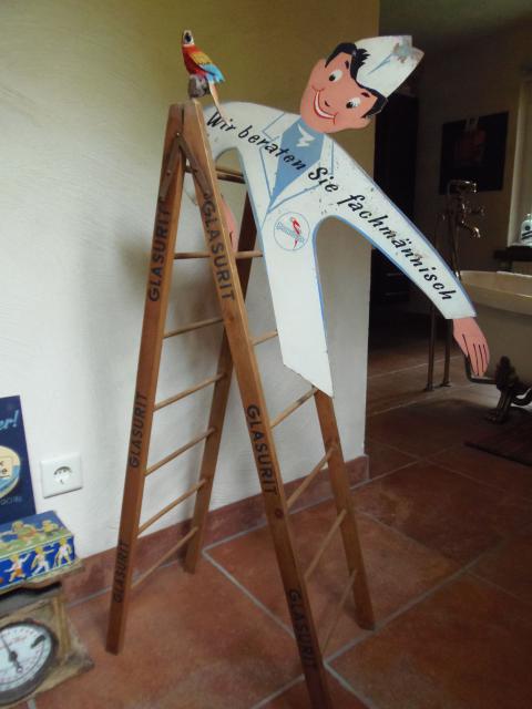 Auch wenn ich natürlich gern den Glasurit-Ara in Emaille hätte, habe ich doch einen kleinen Trost in Form einer Schaufensterreklame. Der kleine Kerl ist mit Leiter etwa 105cm groß, die kleine Leiter ist klappbar wie beim großen Vorbild.