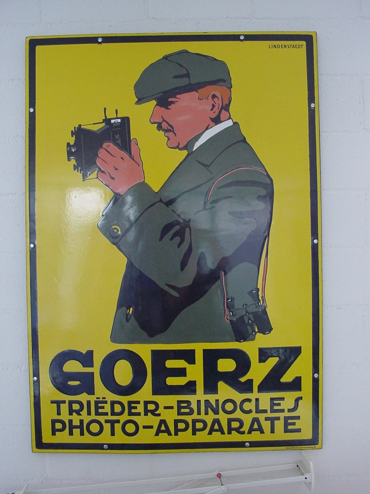 Das Auktionshaus hat nach eigener Aussage auf der Webseite ein großes weltweit bekanntes Expertenteam beschäftigt. Hier schätzen Experten das Schild zeitlich ein in „Deutschland um 1915“ (siehe:http://auctionata.com/o/31034/lindenstaedt-emaille-reklameschild-goerz-fotoapparate-1915#