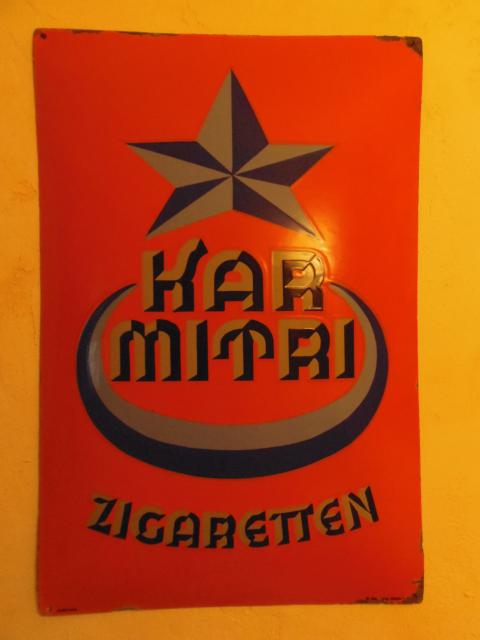 Meines Erachtens nach immer noch eines der am stärksten unterbewerteten Schilder. Karmitri Zigaretten, Entwurf Lucian Bernhard um 1920. Aus seiner Feder stammen berühmte Entwürfe für Bosch, Osram, Manoli, Opel, Adler, …