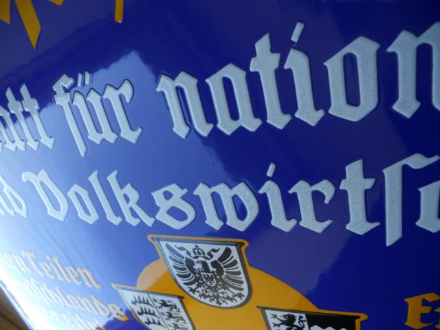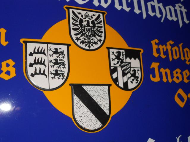 Na wer kennt diese Wappen ? Oben Kaiserreich ?? Wie alt mag das Schilds ein?? Abgeflachter Rand schöne kleiner erhabener Zuckguss (alle Buchsatben auch das Wappen) und in 70 x 50 cm. Top Zustand