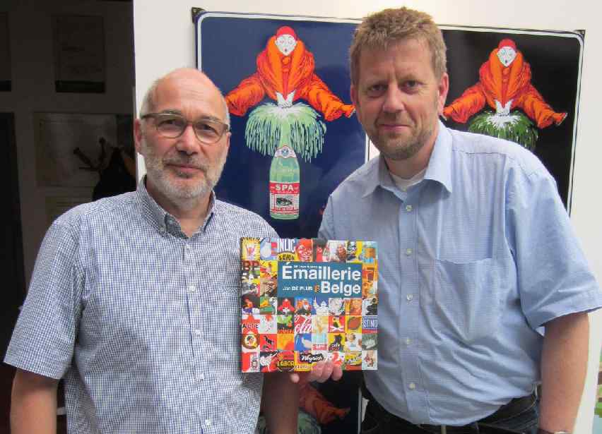 Letzte Woche hatte ich die große Freude in Brüssel Jan de Plus (links im Bild) kennen zu lernen. Jan ist passionierter Sammler und hat mehrere Bücher über belgische Emailleschilder geschrieben. Sein letztes Werk über die Emaillerie Belge 1920-2012 enthält u.a. eine chronologische Übersicht der in der Firma gefertigten Schilder und ist phantastisch bebildert. Da ist es auch nicht schlimm, dass es das Buch nur wahlweise in französisch und flämisch gibt. Die kurzen Infos neben den Bildern über Herstellungsjahr und gefertigten Stückzahlen versteht man auch so. Ich kann das Buch nur jedem wärmstens empfehlen, der sich nicht ausschließlich für deutsche Schilder interessiert – es ist phantastisch. Jan verfügt über sehr viel historisches Firmematerial von belgischen Emaillerien, wie Briefe, Bestellungen, Rechnungen etc. und weiß somit von vielen Schildern wie häufig sie in welchen Stückzahlen produziert worden. Von den belgischen Klassikern Ajja und Boule D’Or beispielsweise wurde jeweils 5000 Stück produziert – kein Wunder also, dass die einem auch heute noch regelmäßig über den Weg laufen. Andere Schilder wiederum wurden nur in sehr kleinen Auflagen produziert und ohne das Buch hätte ich gar nicht gewußt, dass diese überhaupt existier(t)en, wie z.B. das in vorherigem Beitrag gezeigte „Cigares Regal“ mit einer Auflage von 6 Stück.