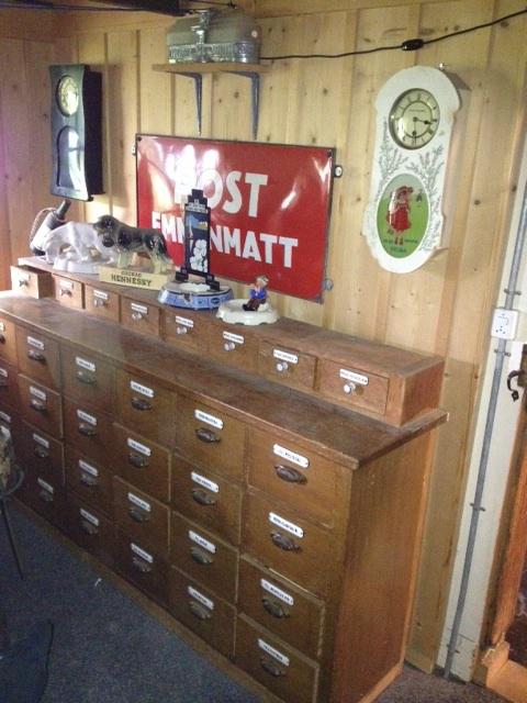 das wahr anno 1989/90 eine drogerie wird altershalber geschlossen und aufgelöst, ich erfahre dies, und siehe da ich konnte 2 schubladenstöcke mit tablaren hohlen…. knappe 2m lang …. die schubladen der untere teil 90 cm hoch und ca 40 cm tief dann eine reihe schubladen 16 cm hoch und 20 cm tief und dann knappe 160 cm hoch mit tablaren….. und das ganze 2 mal …. 🙂 sofort bezahlt, bereit zum 4 mal fahren…… der erste teil zuhause …den 2ten, … als ich bim 3ten mal dort stehe ….sind meine zwei teile mit den emailschilder….. weg…nur noch gleiche dort aber ohne emailschilder…. ich frage wo meine sind, die ich bezahlte habe….. ????? da hat einer für seine werkstadt meine teile genommen …ich natürlich angerufen, und meine zurück erobert 🙂 … da die ganzen schubladen mit den tablaren fast 3.00 hoch waren , habe ich nach langem hin und her, diese oberhalb der oberen schubladenreihe alles abgeschnitten und entsorgt… heute könnte ich 3 m hoche tablare wunderbar brauchen aber was solls….