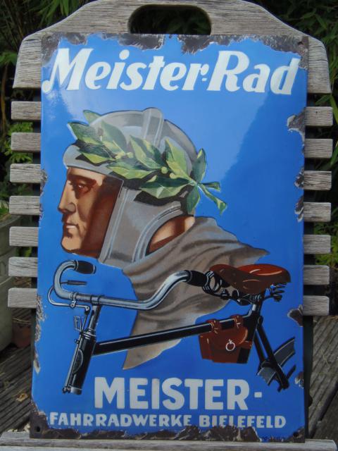Freue mich, einen schönen Neuzugang vorstellen zu dürfen. Meister-Rad in 33×49, Pyro Email ca. 1925. Interessanterweise handelt es sich um eine andere Version als die von Olaf (  http://www.schilderjagd.de/?p=16418 ), der verwendete Schrifttyp ist anders und rechts findet sich kein Wappen. Welches mag wohl älter sein?