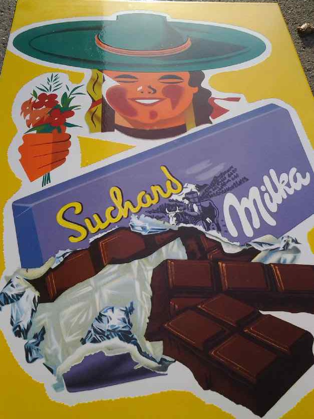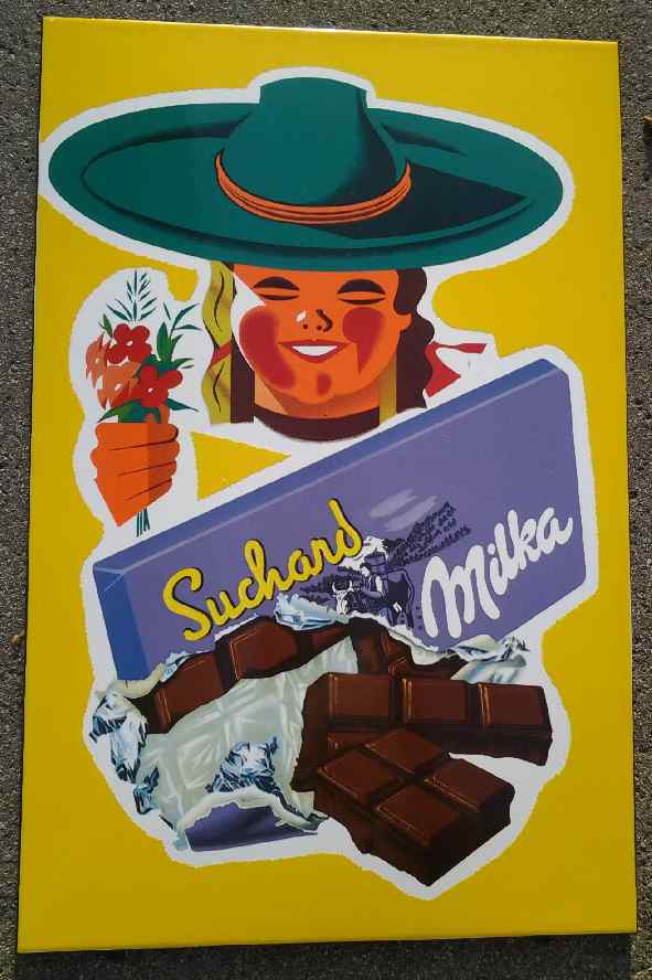 stammt dieses schöne Schild. Aber extrem gut aufbewahrt von seinem Vorbesitzer. Er hatte es wohl in der Zeit wo er bei Suchard gearbeitet hat mit nach hause genommen, dort gut verpackt und auf den Dachboden gestellt wo es in Vergessenheit geraten ist. Bis ich es heute abholen durfte……Farb- und erhaltungstechnisch betrachtet natürlich traumhaft, wie gestern hergestellt. Alleine mit dem Motiv kämpfe ich noch ein bisserl…..aber schau ma mal.