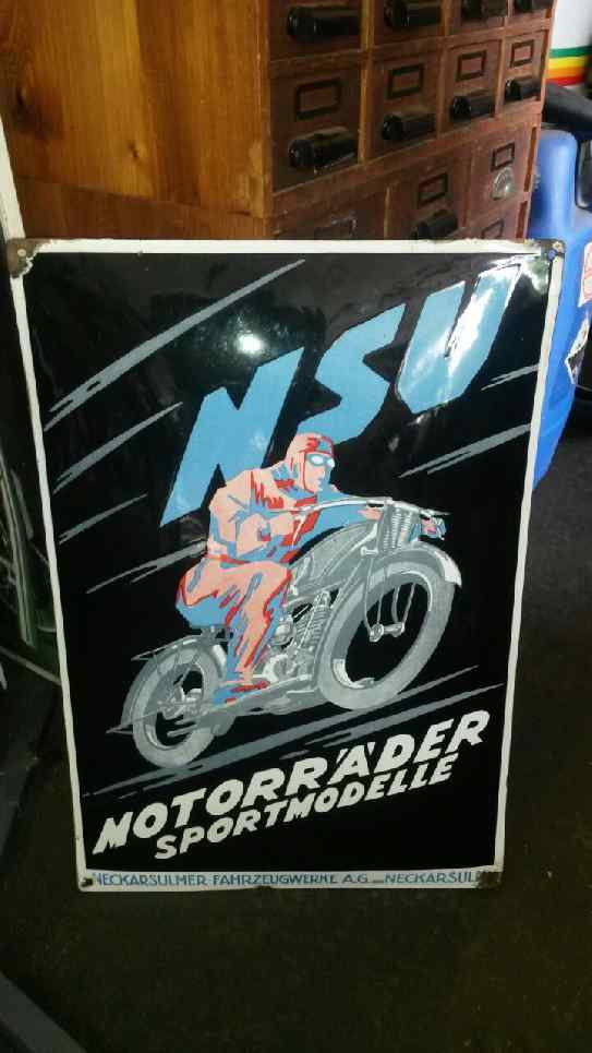 NSU Sportmodelle liegt seit Jahren auf dem Dachboden einer alten Werkstatt bei einem Nichtsammler. Ist noch Original ohne Anmalungen oder Spachtel so wie es um 1930 im Torweg hing.
