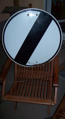 ja das ist große Kunst, der Strich verdeckt nichts, das ist die Erde und der schwarze Banner liegt wie ein Schatten über unsere Welt… könnte aber auch ein halber Fussball sein oder doch ein Aufhebungszeichen aller Beschränkungen lt. STVO. aus Emaille 😉