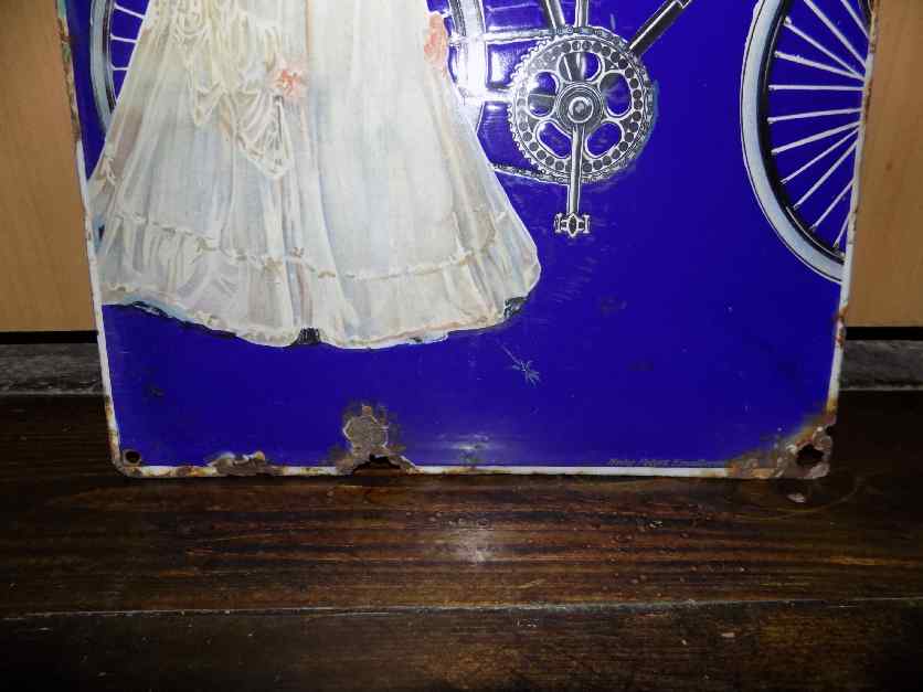Großartig, sowas findet man vielleicht einmal im Leben, das Schild ist um 1901, ich meine es gibt nur diese Ausführung in dem Format in Emaille, jedenfalls bisher in keiner anderen Größe, könnte noch in Blech existieren, und dann gibt es noch das Pendant mit der Nähmaschine.