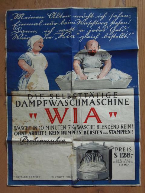 Heute mal ein lustiges Plakat in 46x62cm mit Reklame für die Dampfwaschmaschine „WIA“. Signiert mit „Russell“.
