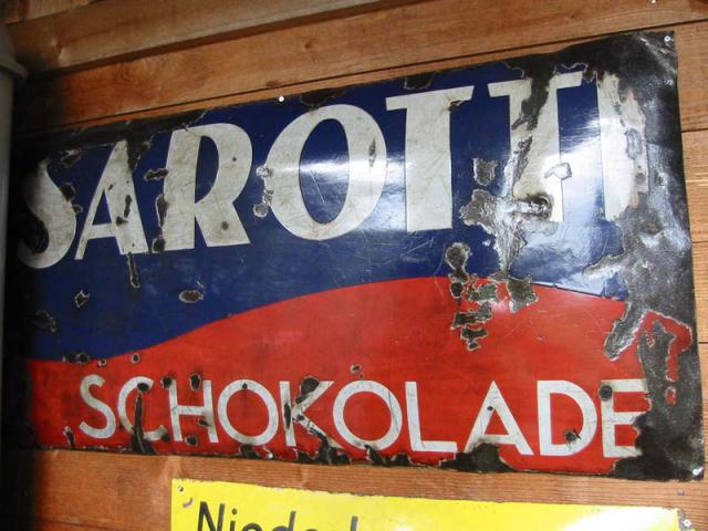 eine schöne alte überlackierte ruine, da würde über alles lackiert… habe ich vor jahren mit dem anderen sarotti schild gekauft, der rest waren porzelanfiguren…uhren teller etc, (da der verstorbene mann dort vertreter war….) kamen dann auf umwegen in die schweiz… welche ich damals stehen gelassen habe…… leider…