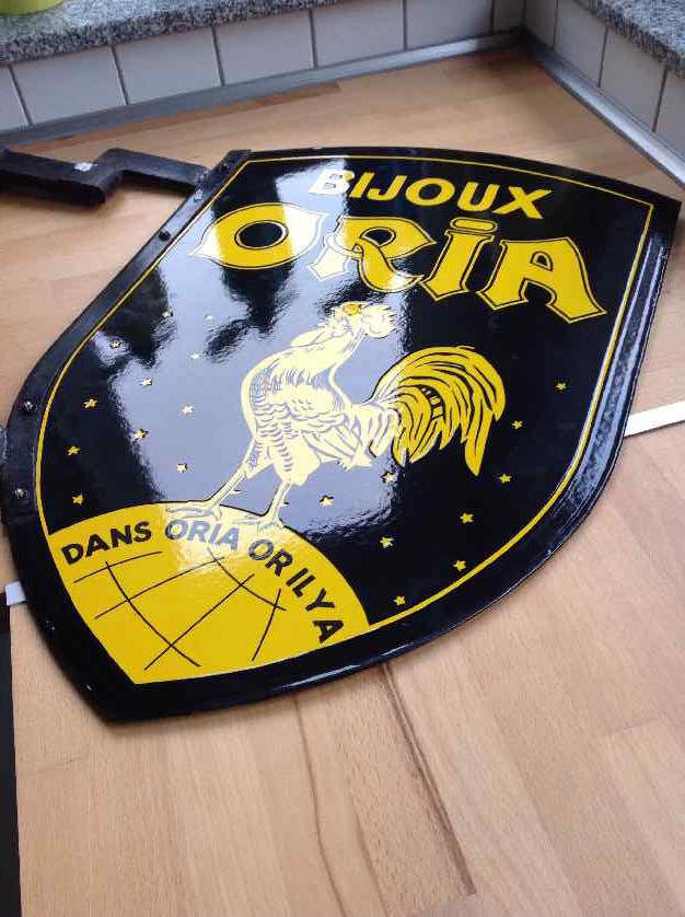 Heute habe ich diesen beidseitigen Ausleger in Top-Zustand gefunden, der Reklame für Schmuck macht und der Hahn paßt ja auch irgendwie gut zu Ostern – somit nettes Oster-Schmuck-Ei 🙂