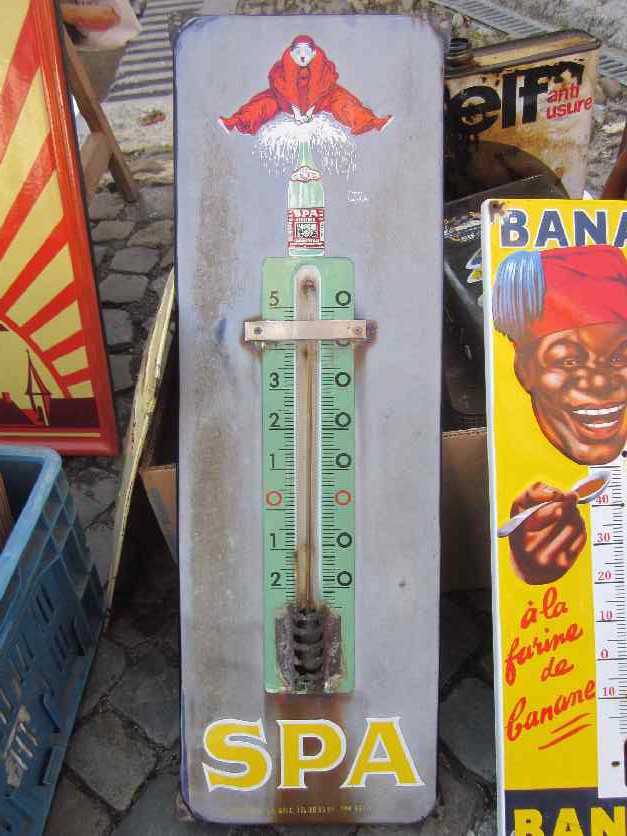Gibt es eigentlich einen Paragraphen, der die Misshandlung von Emailleschildern regelt? Nun gut, das SPA Thermo hat schon bessere Zeiten gesehen, aber welcher Hornochse nietet einen Metallstreifen quer darüber und verlötet es von hinten, damit die Glassäule nicht rausfällt? Hammer, oder? Also mir als SPA-Fan tut sowas echt weh 🙂 Ich wollte das Teil sogar als Kuriosum kaufen, aber der Knabe wollte noch bescheidene 300 Euro dafür … doppelt unfassbar 🙂