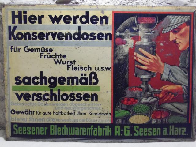 Meine Mutter, die vor kurzem gestorben ist, erzählte mir einmal, dass sie als junges Mädchen mit einem Handwagen zum örtlichen Krämerladen musste, um Konserven wieder verschließen zu lassen. Konserven wurden damals, anders als heute, nicht einfach weggeworfen, sondern wiederverwendet. Nachdem man die Dosen ausgewaschen hatte, wurden darin Erbsen, Bohnen und sonstiges Gemüse und auch Obst oder Fleisch und Wurst eingemacht. Mit den offenen und frisch gefüllten Dosen ging man dann zum örtlichen Kaufmann, dort wurde dann mit einer Konservenmaschine von Hand ein neuer Deckel auf die Dose gerollt. Dazu musste die Dose zuvor ein wenig abgeschnitten werden, dadurch wurde diese im Laufe der Zeit immer kürzer und konnte schließlich immer noch für Leberwurst oder Ähnliches verwendet werden. Diesen Service gab es bei vielen Kaufleuten, auch eine frühe Form der Kundenbindung. Schilder, die für diesen „Konservenservice“ warben, tauchen so gut wie nie mehr auf. Deshalb bin ich besonders froh, ein solches Exemplar gefunden zu haben. Blech, 36x52cm, Seesener Blechwarenfabrik, meines Erachtens nach um 1930 oder früher.