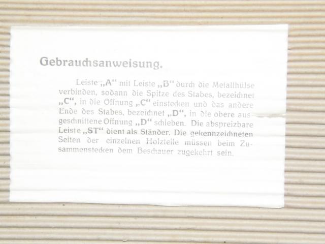 Gebrauchsanweisung.  Leiste „A“ mit Leiste „B“ durch die Metallhülse verbinden, sodann die Spitze des Stabes, bezeichnet „C“ in die Öffnung „C“ einstecken und das andere Ende des Stabes, bezeichnet „D“ in die obere ausgeschnittene Öffnung „D“ schieben. Die abspreizbare Leiste „ST“ dient als Ständer. Die gekennzeichneten Seiten der einzelnen Holzteile müssen beim Zusammenstecken dem Beschauer zugekehrt sein.