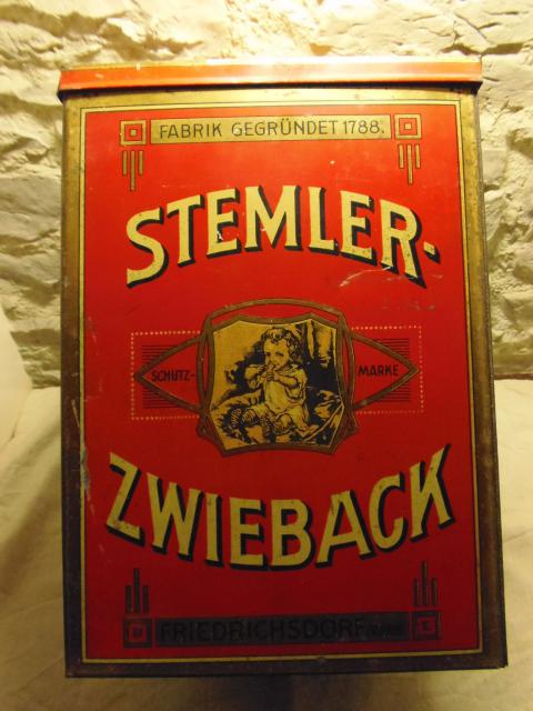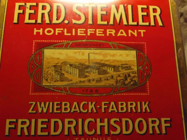 Und doch wieder was Schönes gefunden: Stemler Zwiebackdose, ca. 1910, 35x26x24cm groß. Schöne Erhaltung, tolles Motiv. Oben auf dem Deckel die Fabrikansicht. Schön.