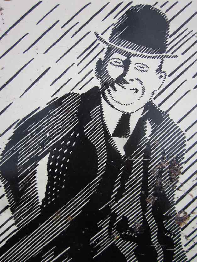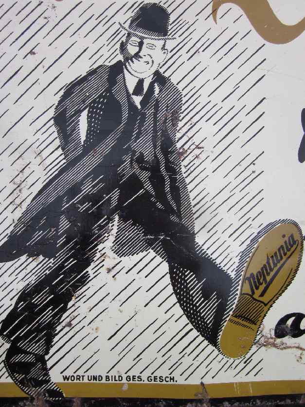 Dieses mir völlig unbekannte „Strichmännchen“ lief kürzlich in der Bucht als normale Auktion und hatte nur 2 Gebote, so dass ich es für unglaubliche 20,50 Euro bekommen habe – freut mich natürlich sehr, aber verstehen muss ich das nicht, oder? Das Blechschild (48 cm x 34 cm) ist schätzungsweise aus den 30er/40er Jahren, hergestellt von Gebr. Koppe AG, Berlin-Lichtenberg. Ich finde diese Strichzeichentechnik klasse, so kommt die Dynamik im Regen sehr gut raus, Person und Regen verschmelzen optisch miteinander. Sogar die Augen bestehen aus vielen kleinen Strichen – klickt mal die Bilder zum vergrößern an. Gibt es noch andere Schilder, auf denen Personen in diesem Graphikstil dargestellt sind? Das Schild kommt auf jeden Fall an die Wand.