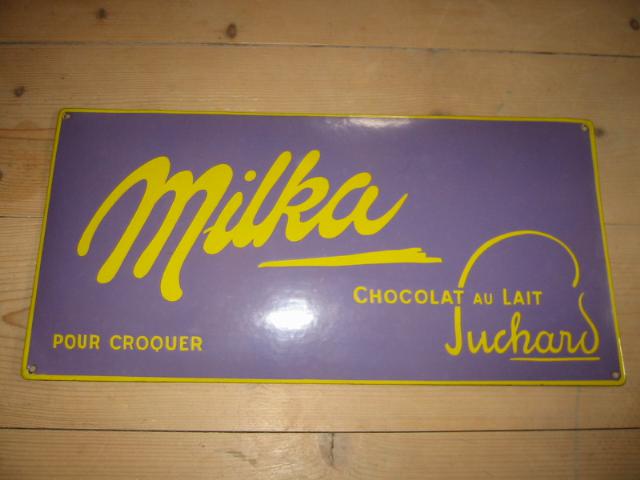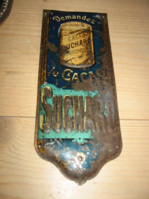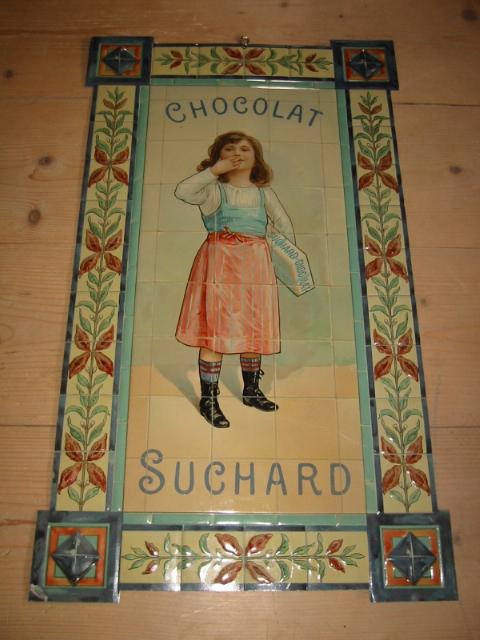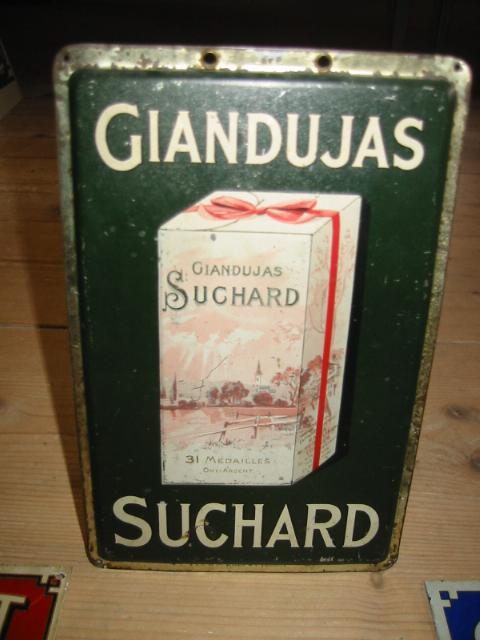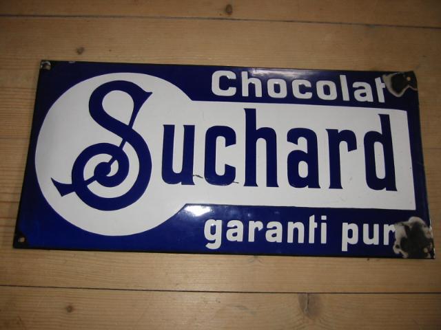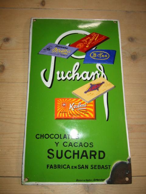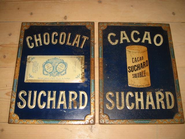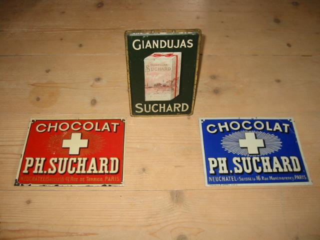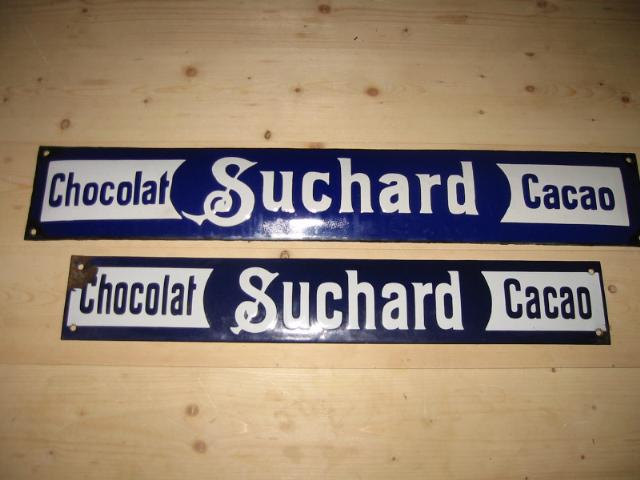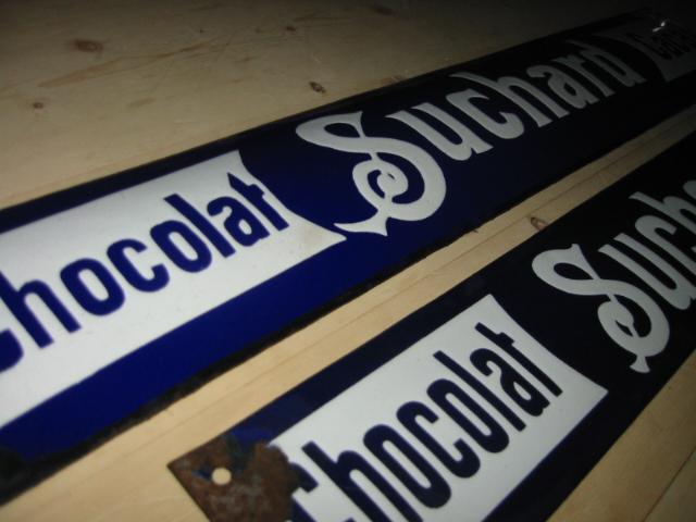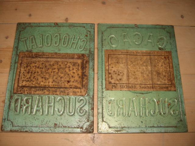 die 3 ersten suchard, das mittlere das italienische suchte ich schon länger, das rechts hat originaler weise einen dunkelvioletten montage metallrahmen darum, hat jetzt aber 2 löcher oben, da dachte ich der rahmen verlohren gegangen, und dann 2 löcher gebohrt…. aber das obere linke loch ist vom email her original…rechts unklar….. wurden löcher in lochlose schilder gemacht um sie aufzuhängen im brennofen…???? eigentlich müsste ich meines aus dem rahmen nehmen…und es prüfen…. ob es auch 1 loch hat…