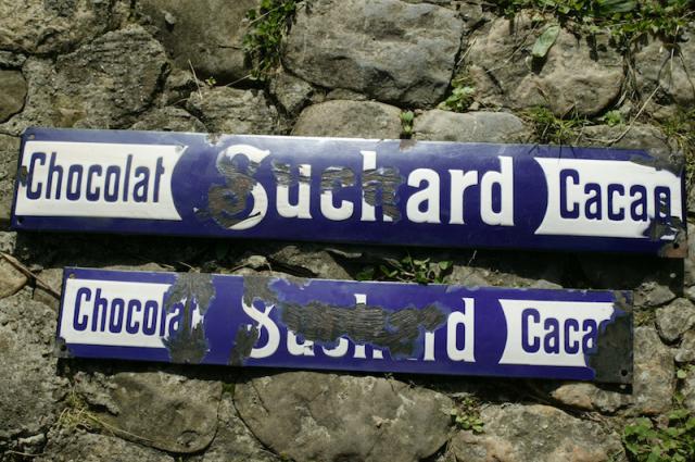 habe diese woche 2 schilder erstanden …….. danke an a…. 🙂 natürlich der zustand ist nicht weltbewegend, aber für mich macht es die sache spannend, da der grössere tresenstreifen wieder von meinem bestehenden in der schriftart massiv abweicht…. all die alten weiss blauen suchard tresenstreifen, notenschlüsselschilder und auch der suchard hundefressnapf habe x variationen mit schrifttypen und arten, zum teil auch in dem grundblech in form und art…..