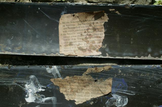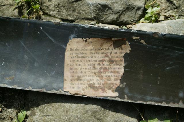 leider sind nur fragmente vorhanden, evtl wäre ja auf der rechten seite ein hersteller vermerkt, oder jemand erkennt die selben zettel auf einem seiner schilder und kann sie einem emailierwerk und allenfalls sogar mit einem jahr in zusammenhang bringen … dies würde mir sehr helfen 🙂
