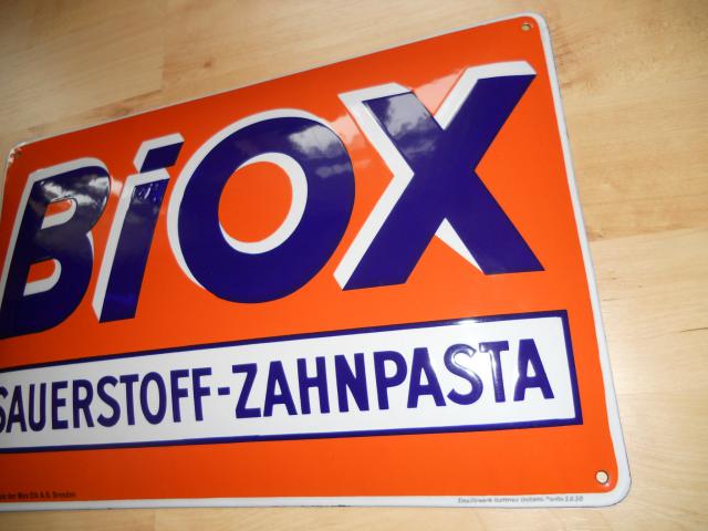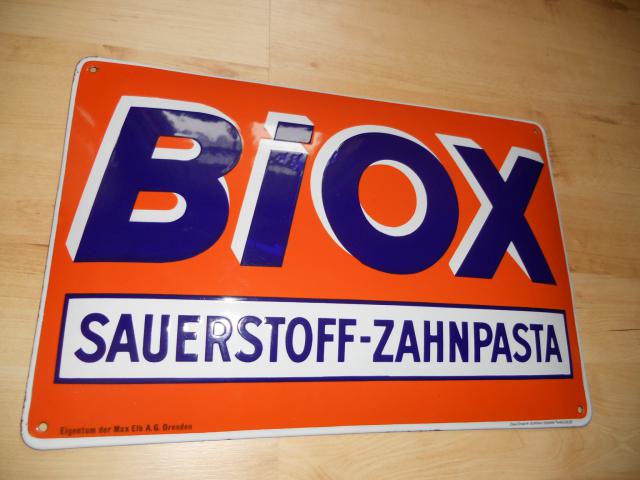 Großes Streifenschild. Selten in dem guten Zustand und Format. In dem Zustand ist mir keins weiter bekannt. Dick gewölbt in tollen Farben bald schöner als der Chlorodont Streifen.