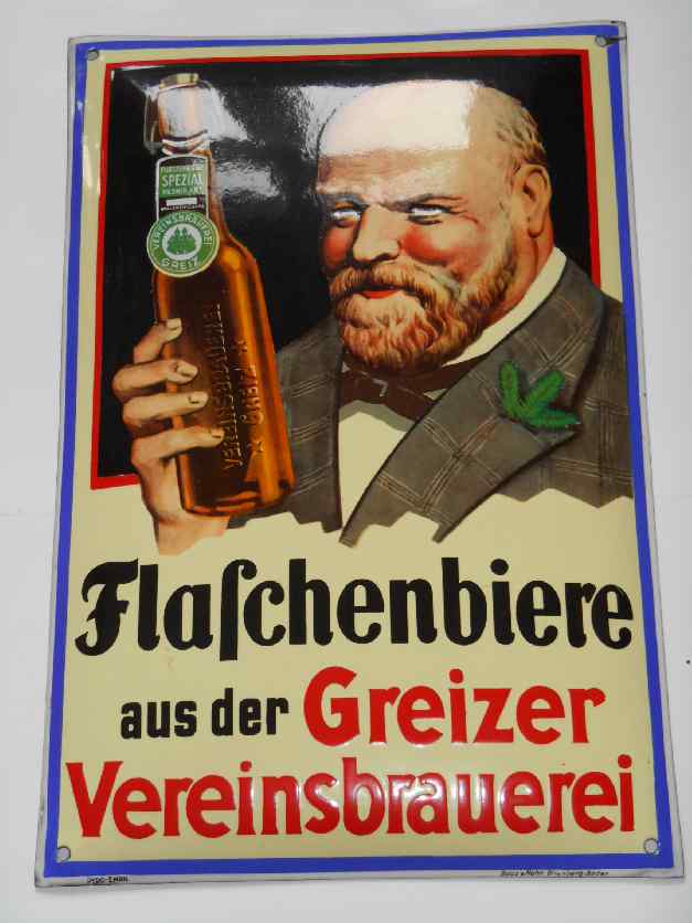 Emailleschild/ Pyro- Email/ Emaillierwerk Boos und Hahn Ortenberg/ Greiz um 1925-35/ gewölbt/ 33 cm x 49 cm/ Zustand 1++/Nur eine Eckbestoßung oben rechts trennen das Schild vom Zustand 0/ Unrestauriert