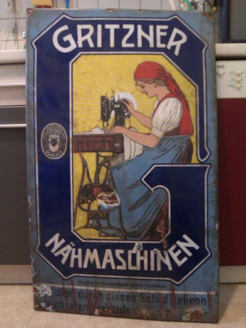 Nur 44 x 44 cm groß. Kleines handliches sehr schwer und dick emailliertes Schild der Gritzner Fahrrad und Nähmaschinenfabrik.