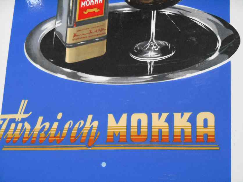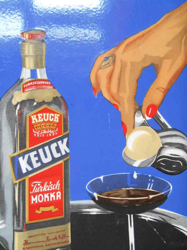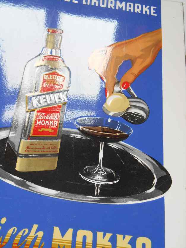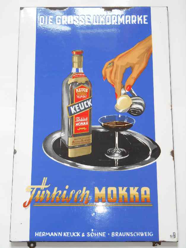 Angeboten wird ein orientalisch anmutendes Emailleschild für eine türkische Mokka- Spezialität aus dem Hause der grossen Likörmarke Keuck, Braunschweig . Eine wahrscheinlich sehr hübsche türkische Dame mit roten Fingernägeln und einem goldenen mit einer Perle besetzten Ring, schenkt elegant einen Tropfen Sahne aus einem verchromten Kännchen ins Likörglas ein, um den Mokka zu verfeinern.  Abgerundet wird dieser professionelle Entwurf, der leider unsigniert ist, von dem unterstrichenen Schriftzug mit den 3 horizontalen Farbtönen. Das Schild sollte einen Platz in der Nähe eines Greilingzigarettenschild haben, beide wirken fantastisch nebeneinander.