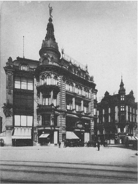 Ein regionales Werbeschild für eine Modepassage der 20er Jahre. Zu Beachtung die Hinweistexte wie Damen- Ruheraum mit Schreib und Erfrischungsmöglichkeit und das Rauchzimmer für den Herren.