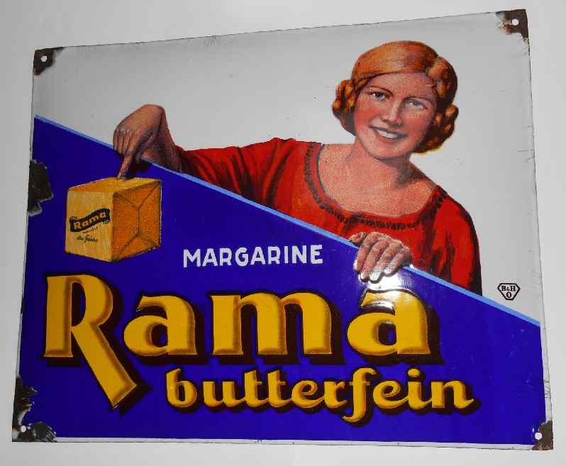 Die sog. Rama Frau gehört mit zu den schönsten deutschen Frauenmotiven der alten Reklame aus der Zeit um 1920. Der Entwurf stammt von C. Mummert. Emailliert wurde das Stück von Boos und Hahn. Zu erkennen am Stempel rechts am Rand. Das Schild ist äußerst selten mit diesen frischen Farben und der hochglänzenden Oberfläche zu bekommen.