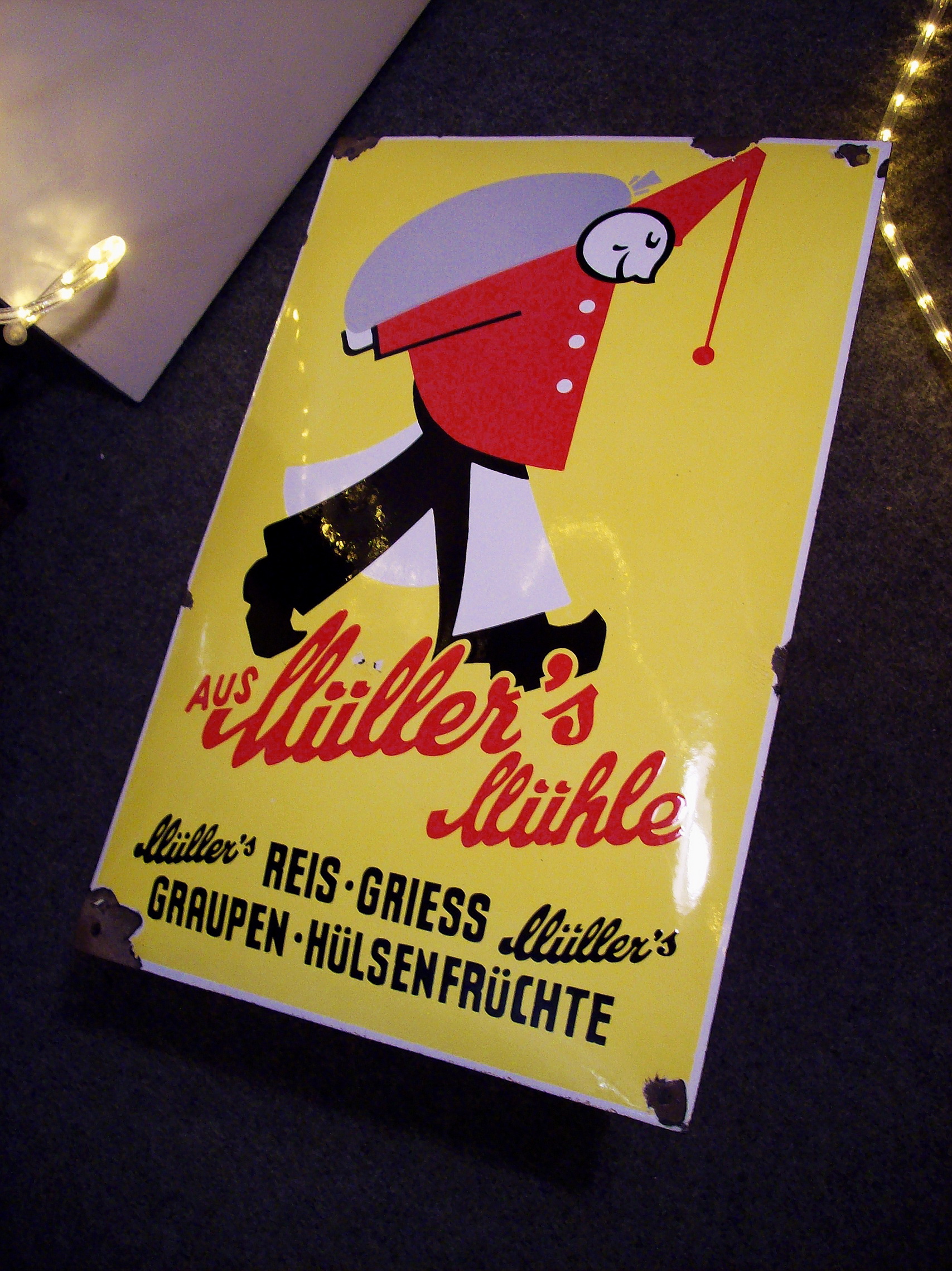 Angebot: Emailleschild Müllers Mühle, dick schabloniert, Deutschland um 1930, Graupen, Hülsenfrüchte, Reis