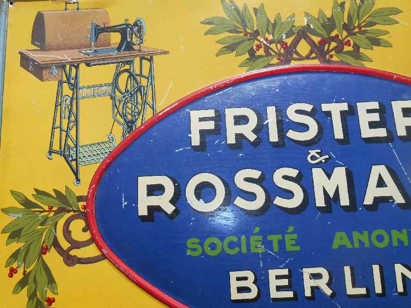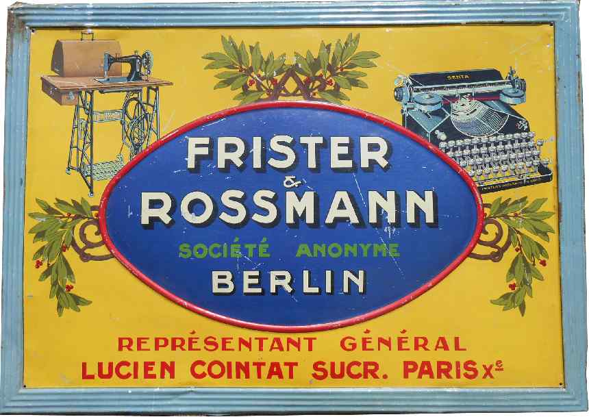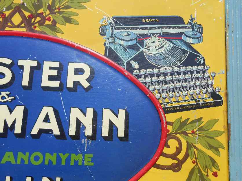 Frühes und großes plakatives Schild vom Hersteller für Schreibmaschinen Frister und Rossmann aus Berlin. Das Schild bewirbt die Generalvertretung in Paris. Nur sehr wenige Schilder überhaupt haben Schreibmaschinen als Motive, lediglich ist ein extrem seltenes Schild mit einer Schreibmaschine von Mercedes bekannt. Hier ein weiteres, wahrscheinlich ein Einzelstück. Schon damals konnte sich diese Marke wie man sieht „auf den Lorbeeren“ ausruhen.