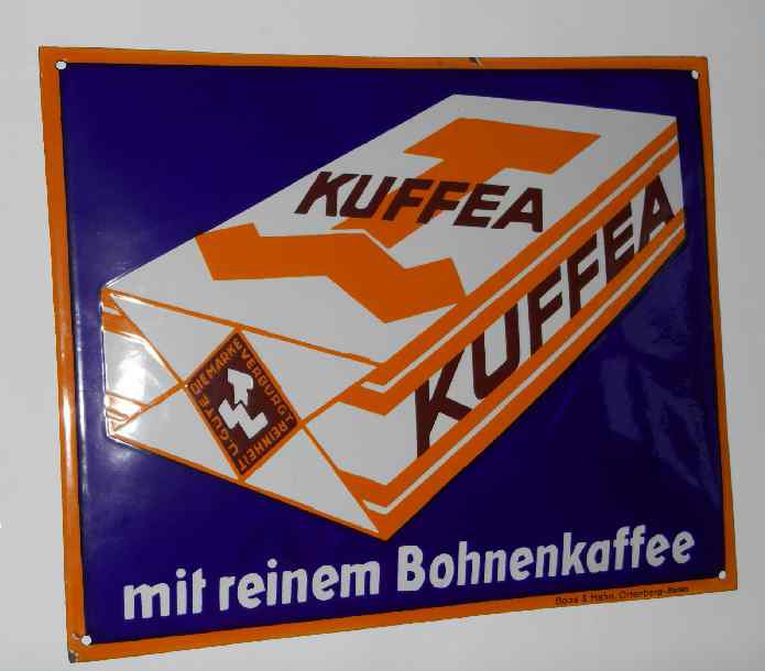 Ein wenig bekanntes Kaffeeschild aus den 20er Jahren der Stettiner Firma Tetzlaff & Wenzel steht zum Verkauf. 1985 wurde die Firma von Walter Rau dem großen Lebensmittelgiganten aufgekauft. Der Entwurf ist dem art déco zuzuordnen. Diese Epoche von 1920-40 war charakteristisch für großflächige unnatürliche Darstellungen als Aufbruch in die Moderne ohne Schattierungen und große Schnörkel aber von großer plakativer Wirkung auf den Betrachter. Dem modernen Kuffea Entwurf- schon fast in CAD 3 D- Qualität- ist dieser Stil kaum abzustreiten.