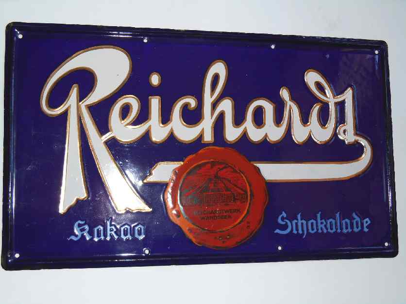 Ein vom Emaillierwerk Elberfeld hergestelltes Exemplar aus Emaille für die Reklame der traditionsreichen Reichardt Schokolade aus Hamburg Wandsbek. Das Schild ist aufwendig mit einer Goldumrahmung und der Fabrikansicht ausgeführt. In dem Zustand sehr selten.