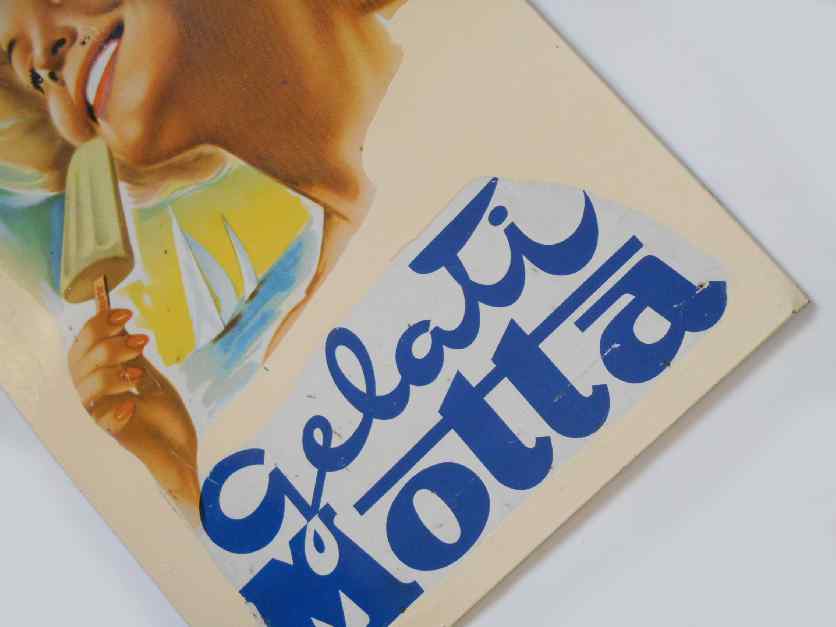 Angebot: Gelati Motta Eis, Blechschild, Italien um 1955, signiert, Entwurf Mario Rossi, Eis am Stiel