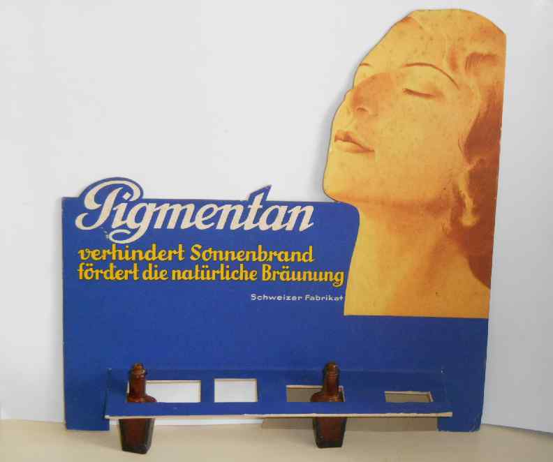 Pappaufsteller ideal fürs Bad/ Schweiz um 1920/37 cm x 36 cm/ flach/ Zustand 2, kleine Fleckchen im Gesicht, Gebrauchsspuren, Knickkante an Haare kaum sichtbar, aber gut erhalten/sehr selten/unrestauriert , Die kleinen Probeflaschen gehören nicht zum Angebot.