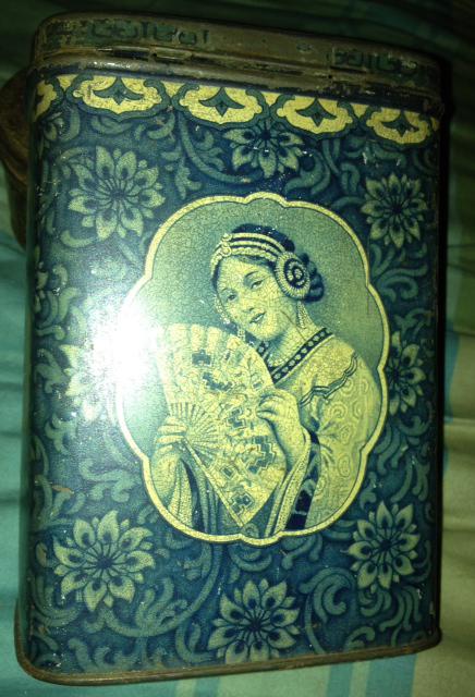 heute eine tolle alte teedose erhalten… leider ohne schrift oder produktename….